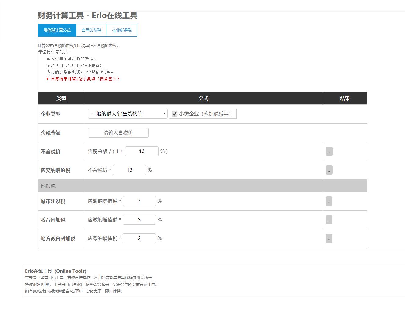 为了方便财务小姐姐使用,Erlo在线工具增加“财务计算工具”。工具包含:增值税、合同印花税、企业所得税